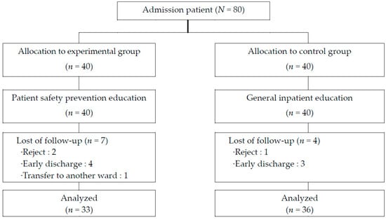 The number of subjects in this study was calculated using G-power 3.1.9.2 (Heinrich-Heine-Universität, Düsseldorf, Germany). According to the calculation results obtained with values of 0.50 for the effect size, 0.05 for the significance level, and 0.80 for the power based on the paired t-test, the number of the subjects was calculated as 34 individuals for each group. In consideration of the drop-out rate, a total of 80 individuals were selected (40 per group), and the subjects were recruited during the study period. The number of samples was calculated through G-power verification during the research plan, and IRB approval was obtained from the relevant medical institution for the selection of research participants. The wards for which the study was conducted were selected as internal medicine and surgical wards with many inpatients for more than one week. The purpose of the study was explained to the subjects who expressed their intention to participate in the study during the hospitalization period through the recruitment announcement for research participation, and the research assistant received the consent form and screened whether it was suitable for the study. The main reasons for dropping out of the subject were early discharge, transferring other wards or hospitals. Researchers and research assistants conducted research on ethical principles, and three to four nurses participated in the study after receiving training on research purposes and patient safety education in advance in the ward. After conducting a preliminary survey on the day of hospitalization, we trained the use of the tablet PC for patient safety education, and visited the target person to repeatedly watch the training video on the 3rd and 5th day of hospitalization. After conducting a follow-up survey on the 7th day of hospitalization, we provided a reimbursement. Finally, patients who were hospitalized from 20 July to 11 September 2020 were assigned to the control group while those admitted from 20 September to 13 November 2020 were assigned to the experimental group. In the course of the study, one individual who refused to answer the questionnaire and three who were discharged early were dropped from the 40 subjects in the control group. Likewise, two who refused to answer the questionnaire, four who were discharged early, and one who was transferred to another ward were dropped from the experimental group. Therefore, the data from a total of 33 and 36 individuals in the experimental and control groups, respectively, were used for the final analysis (Figure 2).