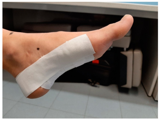 We used the standard Low-Dye taping technique, as it was described by Vicenzino et al. [20]. This is the gold standard technique in studies that use the Low-Dye taping [17,21]. Rigid Leukotape (38 mm) (Leukotape® Sport, BSN Medical, Luxemburgo, Luxemburgo, www.bsnmedical.com (accesses on 16 March 2017) with a zinc oxide adhesive was applied while the subject was sitting with the foot in both talocrural and subtalar joint neutral position, as palpated by the investigator [17]. First the foot was patted down with a dry towel in order to maximize tape adherence [17]. To ensure consistency, the same investigator carried out all taping procedures involved in the study, following a standardized protocol [17]. The longitudinal arch support strips were placed in a side-to-medial direction starting at the head of the fifth metatarsal bone and ending at the head of the first metatarsal bone [20]. The strips for the transverse arch were then placed in a side-to-medial direction under the plantar surface of the foot starting on the anterior surface of the calcaneus bone and ending at the metatarsal heads [20]. The Low-Dye taping was completed with an additional strip for longitudinal arch support to provide additional assistance in holding the support strips of the transverse arch (Figure 4) [20]. Finally, to ensure that the Low-Dye tape adhered and to prevent it from being lost within 48 h, two strips of bandage were added on the back of the foot, thus finishing the taping [20,21].