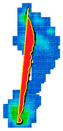 The percentage of the center of pressure locus area (%CLA) is defined like the ratio of the area encompassed by the center of pressure path and a line between the start and end points of the center of pressure path to the foot area [22]. The %CLA, whose unit of measurement is pixel/mm2, was calculated using an image processing software (ImageJ; National Institutes of Health, Bethesda, Maryland, https://imagej.nih.gov/ij/) (accesses on 20 March 2017) (Figure 5) [22].