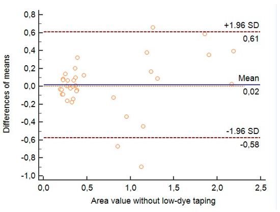 In Figure 6, using the Bland–Altman graph, the dispersion of the results obtained in the first session and in the second session without tape for the variable %CLA is expressed qualitatively. It was observed a little dispersion of the results, noting that most of them are close to the mean, except for 3 measurements that are established outside the 95% confidence interval.