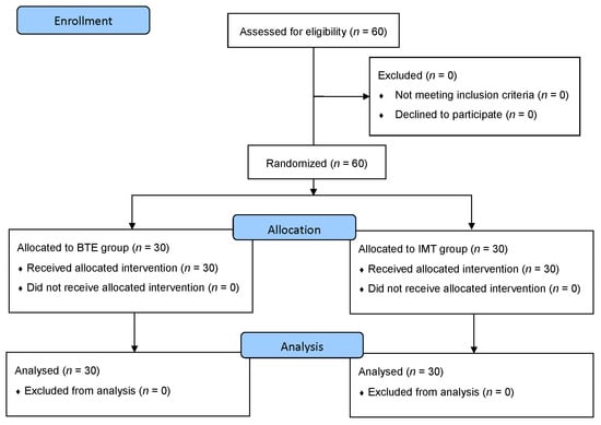 The study was a prospective and randomized controlled trial with two arms that compared the non-pharmacological interventions BTE and IMT. A flow diagram of the study is presented in Figure 1. An a priori power analysis with G*Power 3 was performed, using a predefined power of 0.8, an alpha level of 0.05, and an effect size of 0.5 []. These parameters lead to a required sample size of at least 38 participants in total (n = 19 in each group). We recruited 60 participants, and they were randomly assigned to one of the two intervention groups. After baseline screening and testing, all 60 eligible participants were allocated to the BTE or IMT group by a third person in a blinded manner (i.e., only using the subject number without knowledge of any other identification or baseline test result) using block randomization targeting group sizes of n = 30. Participants were concealed from their allocated arm of the study. BTE, IMT, baseline measurement, pre- and post-intervention assessment were all taught and conducted by a single nurse, who is a licensed thoracic nurse practitioner who had special respiratory training, and is familiar with the physiology of BTE and respiratory muscle work.