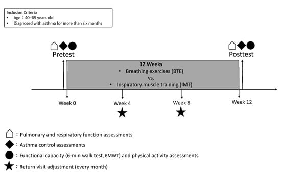 However, there has been no consensus regarding the effectiveness of BTE and IMT in asthmatics [,] because scientific evidence for the efficacy has been lacking until recently, and there are limited high-quality randomized controlled trials (RCT). In addition, the diagnosis of asthma in older adults has frequently been overlooked because it is frequently masked by other health problems, and the literature regarding exercise in asthma for middle-age and elderly individuals is sparse []. In the present study, we aimed to investigate and compare the effects of a 12-week intervention using either BTE or IMT on pulmonary function, respiratory muscle strength, and asthma control (primary outcomes), as well as functional capacity and physical activity (secondary outcomes), in middle-aged and elderly patients with asthma.