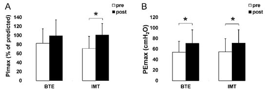 Effects of the breathing exercises (BTE) and inspiratory muscle training (IMT) interventions on the PImax (A) and PEmax (B). Values are mean ± SD. Pretest is illustrated as a white bar, while posttest is illustrated as a black bar. * denotes the significant differences between pre- and posttest within BTE or IMT group. (p < 0.05).
