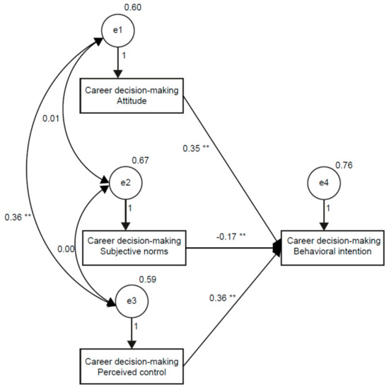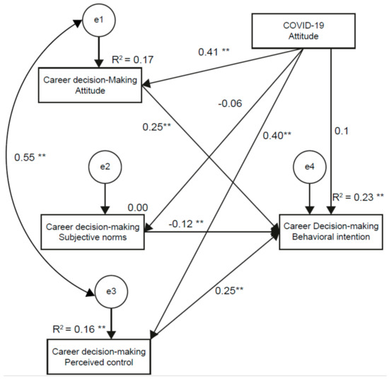 Structural path model of the COVID-19 attitude, career decision-making attitude, subjective norms, perceived control and behavioral intentions with standardized coefficients. Note: ** p < 0.01.