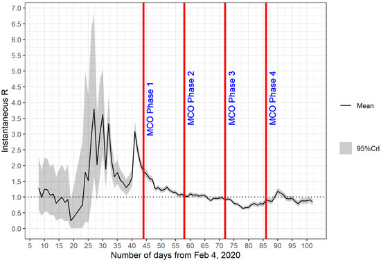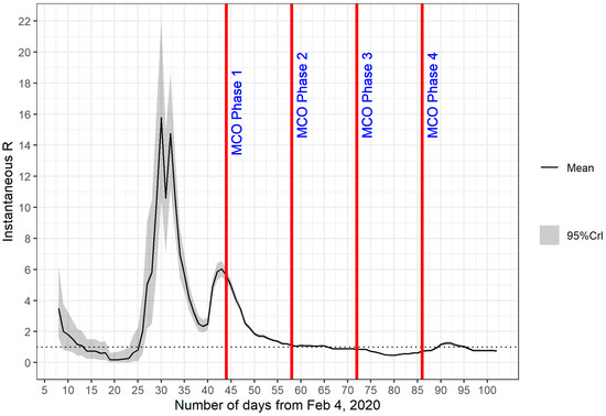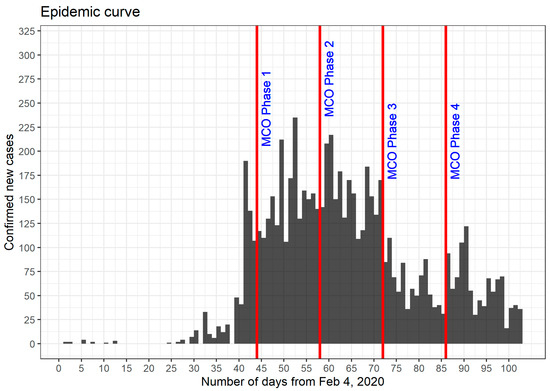 To combat the coronavirus disease 2019 (COVID-19) pandemic, the Malaysian government initiated MCOs, effective on 18 March 2020, with the aim to aggressively contain the outbreak and slow down the transmission rate. This strategy was proclaimed under the Prevention and Control of Infectious Diseases Act 1988 (Act 342) and the Police Act 1967. Offenders violating MCO directives could face a maximum of RM 1000 fine and/or six months in jail or both if convicted [1]. A seven-week MCO was employed, containing four phases, followed by a five-week conditional MCO (CMCO) and subsequently, recovery MCO (RMCO) until to date [2,3,4]. The imposition of different MCO levels was decided by the Malaysian government, considering the livelihoods in communities and the economic stability.