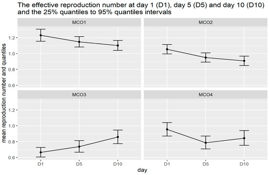 We also extracted the mean Rt values at day 1, day 5 and day 10 for each of the four MCOs (the Rt at day 10 in MCO 4 was taken the third day of CMCO). To see the trend of the mean Rt over 10 days for each MCO, we calculated the difference of the mean Rt between (a) day 5 and day 1 and (b) day 10 and day 5; we also plotted the Rt values (the mean and 95% credible intervals) by using the line plots.