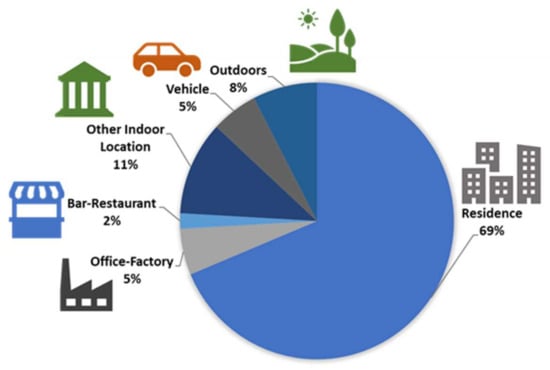 Different life activities cause people to spend a majority of their time in different types of buildings, including residences, offices, schools, and restaurants (Figure 1). The air quality in indoor environments is a significant determinant of human health and wellbeing. Several studies have established links between positive human health impacts and improved indoor environments [,,]. Low IAQ results in unwanted health conditions, including death in the worst-case scenarios. This highlights the importance of the IAQ of any indoor space where humans spend a majority of their time.