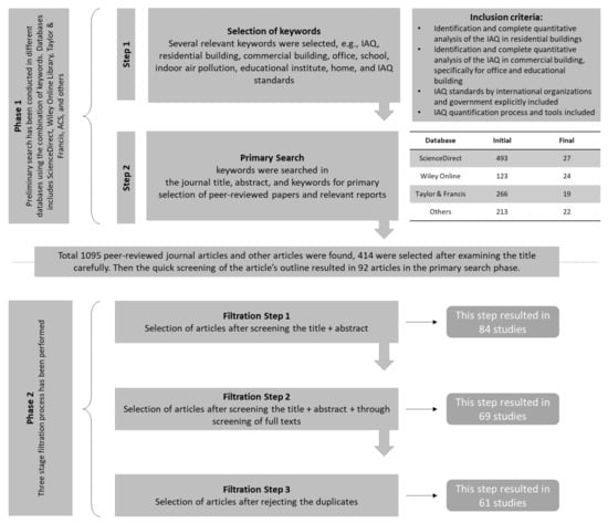 A database search was completed using several combinations of keywords, e.g., IAQ, residential building, commercial building, office, school, indoor air pollution, educational institute, home, and IAQ standards. These keywords were searched in the journal title, abstract, and keywords for primary selection of peer-reviewed papers (phase 1 in Figure 2). A total of 1095 peer-reviewed journal articles and other papers, and reports were returned after the primary search from where 414 articles were selected after the careful screening of the article titles, keywords, and quick screening of the article’s outline. Screening in phase 1 has been done to eliminate those articles that are qualitative in nature and focus on IAQ for other types of commercial buildings such as hospitals, malls, restaurants which are beyond the scope of this review study. To search conference papers and reports, these keywords were searched only in the title. After the preliminary search, phase 2 included a three-stage literature filtration process. In the first step of the literature filter (filtration step 1), elimination was performed after careful reading of the abstracts, based on the inclusion criteria. This phase resulted in 84 studies. Next, we screened the full texts of the remaining 84 studies thoroughly, which resulted in 69 studies for further review. Finally, duplicate articles were eliminated, resulting in 61 papers for final review. The selected studies were classified into specific categories according to the aim of the review. Figure 2 shows the literature search overview with the selection criteria.