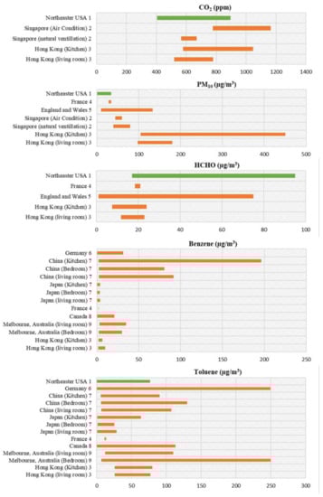 Realizing the potential risk of indoor air pollution, the Hong Kong government began establishing IAQ objectives in the last two decades. To fulfill this target, research has been performed to investigate the IAQ of local residential flats in Hong Kong []. Six housing were selected based on some pre-criteria, including three public rental houses and rest are private housing. Pre-criteria was developed to select those six homes, which includes housing type, highly populated location and finally housing not containing any newly purchased furniture during the sampling of indoor air. All the selected homes were occupied during the experiment, and both the kitchen and living room air was collected for investigation. The results of the investigation indicated that compared to the living room, the concentration of CO2 and PM10 were 14% and 67% higher in the kitchen, respectively. Similarly, the count of mean total bacteria was also 23% higher in the kitchen. Insufficient ventilation was indicated as the major reason for elevated CO2 level in the kitchen, whereas the impact of outdoor air infiltration, infrequent housekeeping, and mode of cleaning were found to have significant relation with higher PM10 level. The influence of cooking using liquefied natural gas was considerably higher in the case of VOC release when compared to natural gas-based cooking. Both new and established dwellings were assessed in Melbourne, Australia, to determine the VOC and HCHO levels []. Although the results indicated lower concentrations of VOCs in established homes; however, compared to the outdoors, these concentrations were four times higher. Moreover, attached garages, faulty wool carpeting, and site contamination were highlighted as sites of higher VOC concentration inside homes. New or renovated buildings yielded one- or two-orders higher VOC emission as compared to established buildings.
