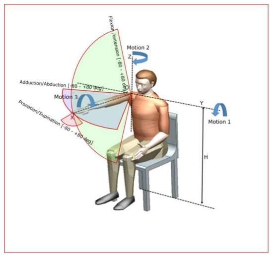 The main design feature of the robotic system consists of two circular guides that lead to a spherical motion of the characteristic point of the mechanism. Starting from the concept stage, the patient is embedded in the design of the robotic structure, and the center of the sphere given by the two circular guides is placed in the center of the patient shoulder, allowing the entire arm motion with respect to the shoulder rehabilitation motion. The targeted motions of ASPIRE are flexion/extension of the shoulder with a motion range of +/− 80 degrees, adduction/abduction of the shoulder with a motion range of +/− 80 degrees, and pronation/supination of the forearm with a range of +/− 80 degrees (