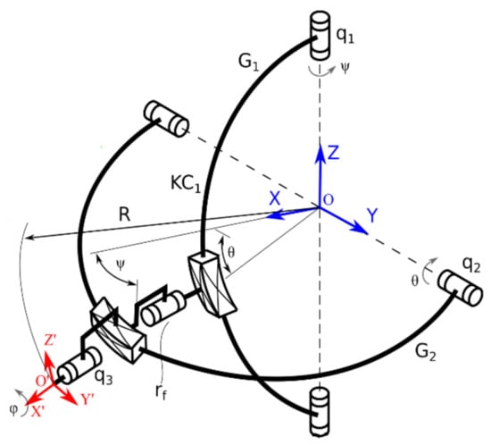 3. Ψ, θ and φ represents the angular displacement of the reference characteristic point with respect to the reference system OXYZ. The equations of the active joints are given in Equations (1)–(3).