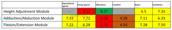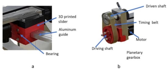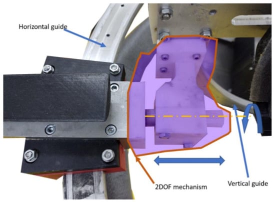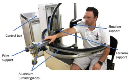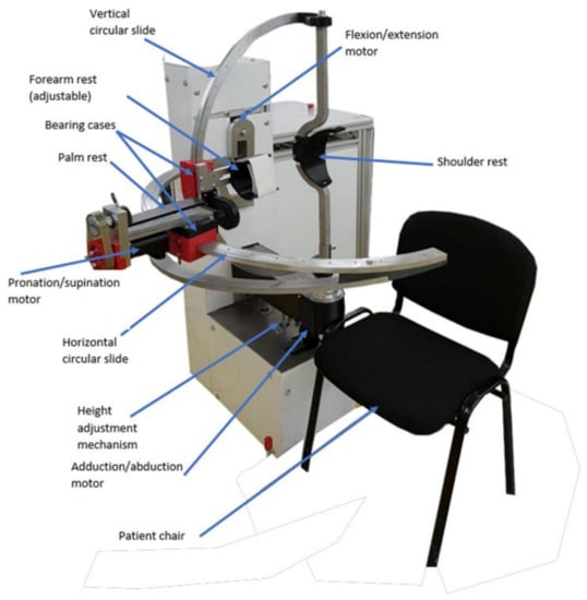 Figure 3. Along with the kinematic elements needed for the rehabilitation motion of the shoulder, other aiding elements were added. The frame of the robotic structure was made of aluminum profiles, and the case of the robot was made of Plexiglas. The circular guides were manufactured from aluminum, and the sliding carriages were 3D-printed and properly greased to ensure a low friction coefficient. The shoulder rest was also 3D-printed in such a manner to ensure the support of the shoulder during the flexion and extension motions. The forearm support was 3D-printed and embedded into an adjustment mechanism to fit different lengths of the forearm. The palm rest was made of aluminum and embedded into the pronation/supination mechanism. The connection between the vertical circular guide and the horizontal one was made using a passive revolute joint between the circular guides. An actuated height adjustment mechanism was added to allow easy setup of the robot between patients of different heights.