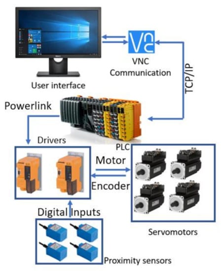 Figure 5) that communicates with the Programable Logical Computer (PLC) of the robotic system through Virtual Network Computing (VNC). The PLC controls the two drivers of the system that ensure the functioning of four servomotors and receives data from four proximity inductive sensors.