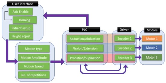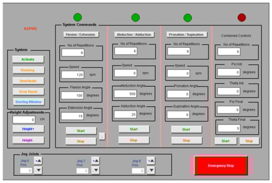Figure 6. The setup of the robotic system is made using the user interface, where the first step is to power up the motors and the initialization of the motion axes. After the robotic system is initialized, the patient setup is performed, and the height of the rehabilitation device is adjusted to the height of the patient. The user interface allows the selection of the rehabilitation motion, and the motion parameters are given by the kinetotherapist and input into the interface in terms of the amplitude, speed, and number of repetitions.