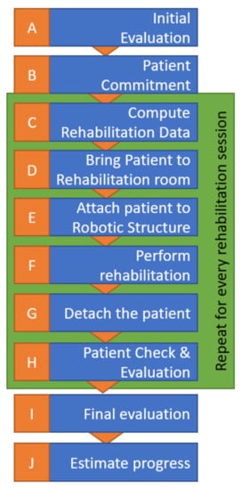 The patient will be caried to the robotic rehabilitation room by a stretcher-bearer using a wheelchair or walking, depending on the health state of the patient.