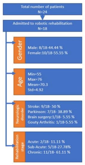 The clinical study performed on 24 patients with different neurological disorders with upper limb impairment aimed to evaluate the performance of the robotic system compared to the human therapists. The patients were split into three groups: