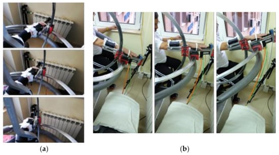 All 24 patients performed the same therapy for seven consecutive days with two daily sessions. To perform identical exercises, which would enable a proper comparison of the therapeutic results, in this initial set of tests, only simple motions were performed: flexion/extension and adduction/abduction. The starting values for the motion amplitudes were established by the neurologists at the individual level and increased daily 5–10%, aiming to reach a full range of motion on the fifth day.