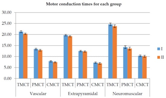 Figure 16 illustrates the motor conduction times for the three groups measured before and after rehabilitation therapy (lower is better).