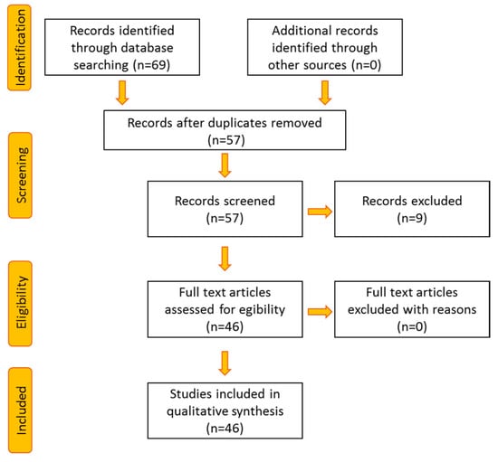 The literature research was conducted on Scopus database, using the following keywords: “thermography” OR “thermal imaging” AND “Covid-19” OR “Sars-Cov-2” OR “Ebola” OR “pandemic” OR “fever screening”. The search was performed for the article title, abstract and keywords, and limited to the original articles (i.e., Conference paper, Review, Letter, Short Survey were excluded) concerning the subject areas Engineering, Computer Science and Medicine. The database provided 69 results, which were investigated through a manual review procedure to identify the papers suitable for this work. Particularly, papers not related to IRI data analysis, or automatic face recognition, or ROI selection for fever screening or disease classification purposes were excluded. After this review process, 46 papers were included in the study (Figure 1). The resulting papers were analyzed and grouped based on the operative RQs.