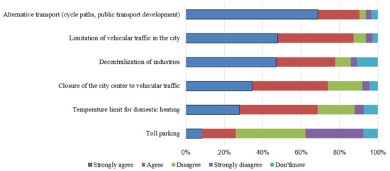Similarly, the measures to limit air pollution were supported by more than 60% (Figure 2), except for the introduction of toll parking (less than 30%). All the other initiatives were more supported by students with higher FHL and higher internal locus of control (Table S3). Limitation of vehicular traffic in the city and closure of city center were more supported by people with a higher level of risk perception. No differences were found on the basis of gender, FHL, or area of residence. The index of global support towards measures to limit air pollution was positively associated with the FHL, the global health risk perception index, the global trust in institutions, and the internal locus of control.