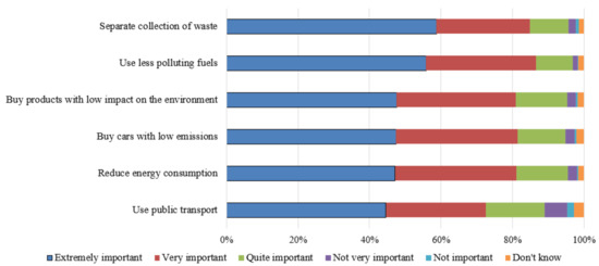 On the other hand, except for the separate waste collection, the frequency of people adopting positive behaviors was about half of the one of people declaring their importance. This finding was sometimes confirmed by the literature, while in other cases environmental behaviors were aligned to attitudes at the various degrees of correspondence [19,20]. The reasons of this contradiction could be found in the complexity of determinants for pro-environmental behaviors, that different psychological or sociological models have tried to explain [2,6,7,8].