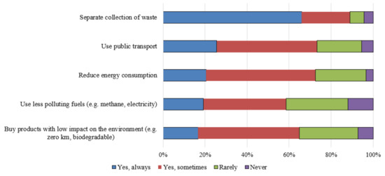In recent years young people, mainly students, became increasingly sensitive about the environmental issues, as demonstrated by movements such as Friday for Future or School Strikes for Climate [11], but the effective promotion of pro-environmental behaviors has not been proven. Some studies have indicated that the age group 18–24 years is less concerned about environment and less inclined to adopt pro-environmental behaviors, even when concerned [16]. University students are often surveyed about these issues because they are considered the future decision makers, but also, they are very accessible for administering questionnaires [17]. In our survey, on the whole, a high proportion of students showed very positive attitudes towards pro-environmental initiatives and actions, while they mostly were opposed to potentially negative interventions. Similar results were reported by other studies in analogous populations, even in different countries [18].