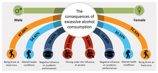 Our results showed that AC was frequently associated with harmful incidence and altered states of health (Figure 2). Worldwide, studies have reported the heavy AC among college student population is associated with numerous negative consequences, such as health issues (vomiting, headache, dizziness, etc.), physical and violence-related problems (assaults, driving under the influence of alcohol, car accidents, etc.), and other injuries [29,30,31]. Women drink to socialize, to relax, to improve their mood, or to escape boredom, while males consume alcohol for image and reputation, they drink “to be cool” and to be more popular among their friends [32,33,34]. The negative consequences of AC are influenced by the body weight, the alcohol tolerance, the speed of consumption, the metabolic rate, the level of hydration, and the food intake [35,36]. Generally, women are more susceptible than men to react to heavy AC due to several reasons. Foremost, women have less enzymes (alcohol dehydrogenase and acetaldehyde dehydrogenase) used to metabolize alcohol, they have a higher body fat to muscle ratio, thus blood and tissue concentrations of alcohol are higher in women, their body size is usually smaller, so women have less water to diffuse the alcohol in their blood stream and, not least, the female hormonal status tends to make women more vulnerable to experience the effects of excessive AC [11]. Men are more likely to take risks while drinking, evidenced by a high rate of car crashes, drink driving over the legal alcohol limit, increased aggressive behaviors, etc. [37,38].