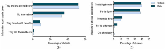 Information about the special beers already knew by students at the time of questionnaire (a). The main reasons why male and female students are choosing to drink special beers (b).