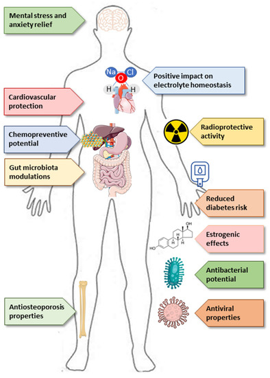 The functional and potential health properties of special beer have been extensively reviewed in several studies [13,51,52]. While lacking high contents of alcohol, NAB and LAB can be more nutritious and potentially functional than regular beer [13]. NAB and LAB are a reliable source of vitamins, minerals, soluble fibers, polyphenols, and flavonoids [13]. The non-alcoholic beer fraction might improve bone health in postmenopausal women, and the effects of beer on body hydration [53]. When ingested before physical exercises, beer with lower alcohol content has a better rehydration effect, while alcohol-free beer may even have a positive impact on electrolyte homeostasis [54] or gut microbiota [55]. Different studies have focused on the effects of moderate alcoholic and NAB consumption on health and diseases, including cardiovascular disease, obesity, diabetes, cancer, cognitive decline, osteoporosis, with promising results, nevertheless need further particular in-depth investigations [13,56,57]. The consumption of NAB (0.9% ABV) also seems to have a protective action over learning and memory abilities [58]. Franco et al., have examined the effect of NAB on anxiety levels in a stressed population. Subjects rated their stress levels lower after drinking NAB for 14 nights, compared to a control period when they did not drink. All these studies came to the same conclusion: that drinking 330 mL of NAB during evening meals on two weeks may decrease feelings of anxiety and stress. These results are promising, but it must be stressed related research is still at an early stage [59]. A non-alcoholic beer component, β-pseudouridine, was found to be a potent protector against the damage caused by radiation (radioprotective effect) [60,61]. Potential properties of beers’ nonalcoholic fractions are presented in Figure 5.