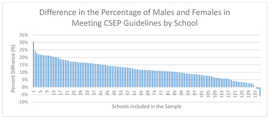 Figure 1 visually presents the difference between the percentage of males and the percentage of females meeting the CSEP guidelines for each school included in the sample. Schools with a positive percentage indicate that a greater percentage of male students compared to females met the CSEP guidelines, and schools with a negative percentage indicate that a greater percentage of females compared to males met the CSEP guidelines. The purpose of this figure is to demonstrate that the majority of schools had a higher percentage of males, compared to females, meeting the CSEP guidelines. More specifically, the percentage of males meeting the CSEP guidelines was higher compared to females in 97% of schools. One school has an equal percentage of males and females meeting the CSEP guidelines, and 3 schools had a larger percentage of females meeting the CSEP guidelines compared to males (range = −6% to 30%).