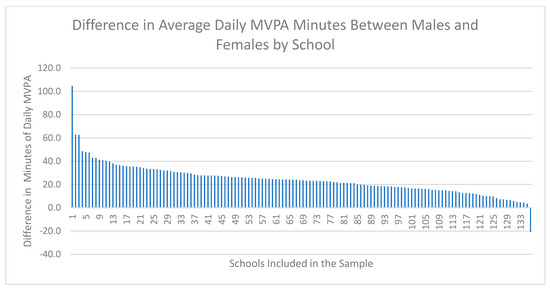 School-level differences between average daily minutes of MVPA for male and female students from Year 7 (2018–2019) of the COMPASS Study. Note: The difference is calculated as the average daily minutes of MVPA for males minus the average daily minutes of MVPA for females.