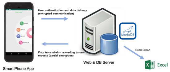 It was designed so that, when using an app, the data of log-ins, test results, frequency and type of use, etc., would be accumulated. The database was created by building a Java-based development environment. The tools used were VSCODE (Microsoft Corporation, Redmond, WA, USA), GIT (GIT, New York, NY, USA), MySQL Workbench (Oracle Corporation, Austin, TX, USA), Cyberduck FTP (Cyberduck, Boston, MA, USA), and Safari and Chrome browsers. Development languages were PHP v7.3, HTML, Javascript, and CSS. The database development environment was MariaDB v10 (MariaDB Corporation, Redwood City, CA, USA), and it was developed on a MAC OS. The Linux server (Red Hat, Raleigh, NC, USA) was used, and the goal was to store all data on the server and accumulate big data. The server receives and stores data from smart devices, which is the basis for analyzing data to identify mental health and other conditions and provide customized services (Figure 1).