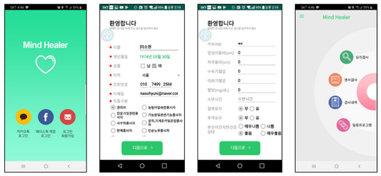 Basic composition of the Mind Healer App. Login screen/Input page of Personal information/Input page of perceived health status/Psychological test and sensor test page.