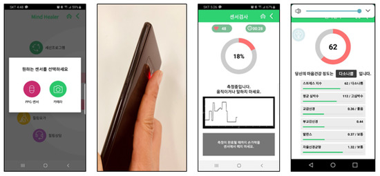 (2) A biometric index sensor test was conducted to determine the stress measurement and mental and physical relaxation functions using photoplethysmogram (PPG) sensor or camera sensor which installed in the smartphone. The PPG sensor is a device that projects light with a particular wavelength onto the measured object, detects the light that is reflected off or goes through it, and detects the pulse signal from the user. Then, it converts the detected pulse signals into digital data to define stress indices by using pulse measurement methods (Figure 3) [24]. As a technical method of measuring and analyzing heart rate, the stress index is measured by grasping the average heart rate, sympathetic, parasympathetic, and autonomous balance [25,26]. PPG is a simple and inexpensive optical technology that is efficient for calculating pulse rate variability (PRV) [27,28]. Measurement of heart rate variability (HRV) is known to have information on very-low-frequency (VLF) and low-frequency (LF) sympathetic nerves, and high-frequency (HF) parasympathetic nervous system, especially the vagus nerve and respiratory activity. By calculating the value, it is possible to know whether the user is in a stress state [29]. To characterize HRV, many authors [30,31] have proposed a variety of hand-crafted HRV metrics that are computed over time intervals between heart rate.