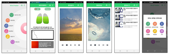 The app was developed based on a pilot test in Hwang and Jo [4]. It was conducted for about four months from February to May 2019 based on an analysis of literature, research results, satisfaction, and expert consulting. The program consists of healing music, healing meditation, healing breathing, healing yoga, and counseling. It was designed to enable interactive communication and management information for mental health. After installation, the mobile app was freely used for 12 weeks. Participants were to use it at least twice a week for 10 min. An alarm was set to encourage participants to use the app and induced continued use by providing health education every week.