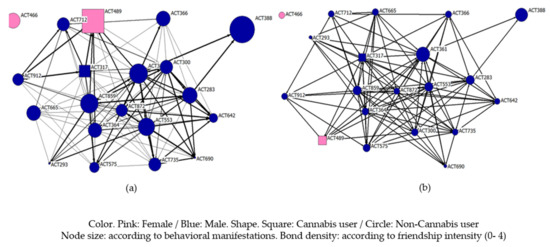Figure 2 represents the classroom friendship network, where males are represented with a blue color and females with a pink color. Cannabis users are identified as square-shaped nodes and nonusers as circles. The size of the nodes varies according to their total stress. The intensity of the relationships is measured through the strength of the ties (0–4), where a greater strength indicates that these students are united by a bond of friendship by spending a large part of their free time together. The size of the nodes varies as a function of the total stress scores. Thus, we find how individuals who are consumers are close and could be considered friends. These nodes, although they have relationships with those actors who are more central, establish ties of greater intensity with actors who are on the periphery. However, it stands out how the girl who uses cannabis establishes ties of friendship with the central actors, being, in addition, one of the individuals with higher levels of stress. In general, we found a dense network, where relationships of varying intensity were high. We found an isolated node and a node on the periphery that only maintains a relationship with two individuals from the others in the class, being also one of the individuals with the highest level of general stress.