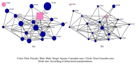 Figure 4 shows the two networks, but, in this case, the size of the node varies depending on the cannabis use intention. Although most of the subjects obtained scores according to the mean, we found nodes of greater size, whose scores were indicative of an intention higher than normal. These actors are found both in the periphery and in the center of the network and are individuals in whom action must be taken through different intervention strategies when they are in a situation of risk at the beginning of cannabis use.