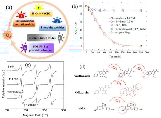 (a) Reported pathways of 1O2 evolution; (b) the quenching effect of 1O2 on phenol degradation with β-MnO2 (data reorganized from [19]); (c) EPR characteristic spectrum of TEMP-1O2 (figure reprinted from [31]). The EPR spectrometer settings were as follows: modulation frequency, 100 kHz; modulation width, 0.079 mT; scanning field, 335 ± 10 mT; amplitude: 2–500; time constant, 0.1–0.3 s; sweep time, 4 min; microwave power, 4 mW; and microwave frequency, 9.41 GHz.; (d) oxidation pathways of some emerging contaminants by 1O2 [8,34,38], reprinted with permission from Elsevier.