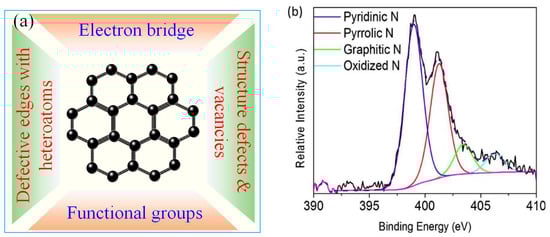 The increase of carbonyl groups and graphitization degree would create more vacancies and defects to enhance the catalytic performance of GO/rGO [27]. A simple but effective strategy is to modulate rGO by heteroatom doping [64]. Carbon doped with N is expected to possess more lattice defects for regulating the electronic structure, such as sp2-hybridized carbon skeletons [65,66]. Kang et al. reported that N-doping could significantly improve the activity of reduced graphene oxide (N-rGO) for PMS activation using urea as the nitrogen source [67]. It was found that pyridine N, pyrrole N, graphite N, and oxidized N in N-rGO catalyst accounted for 49.7%, 35.2%, 9.0%, and 5.9%, respectively (Figure 3b). •OH, SO4•− and 1O2 were potential active species for pollutant degradation. As previous reported, pyrrolic N sites were important to adsorb and activate PMS to form 1O2 [68]. Doping nitrogen into carbon matrix is not only beneficial to PMS adsorption due to the increase of surface basicity, but also facilitates electron transfer to the negatively charged PMS, thereby enhancing the catalytic activity.