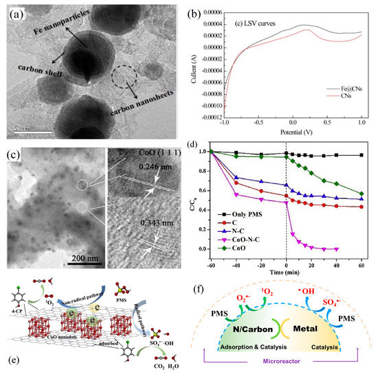 Another common iron catalyst is the nanoscale Fe3O4 which exhibits better stability than zero valent iron. The catalysis ability of Fe3O4 relies on its surface structural Fe(II) but not released Fe2+ ions. To overcome magnetic aggregation, Fe3O4 nanoparticles can be typically immobilized on functional supports to yield a controllable structure. The composite materials activate PMS/PDS with diverse active components so as to form multiple ROSs. Pi et al. obtained OBC-Fe3O4 via coating Fe3O4 nanoparticles onto oxidized biochar (OBC) with better adsorption and pollutant degradation performance than Fe3O4 and oxidized biochar [93]. A stable chemical bond was established between spherical Fe3O4 and OBC. The oxygen content of the catalyst increased after reaction, indicating that the oxygen-containing functional group as a bridge for electron transfer played an important role in the process of adsorption and degradation. Fe3O4 activated PDS to produce radicals of •OH and SO4•− [94], while the sp2-hybrid C atom with defective structures and ketone groups mediated electron transfer to generate 1O2. Thus multiple ROSs including SO4•−, •OH and 1O2 would participate in the degradation of tetracycline. Moreover, OBC as carrier of Fe3O4 promoted the adsorption of tetracycline on the catalyst surface, thereby increasing the interaction between ROSs and tetracycline and enhancing its degradation. Liu et al. designed a core-shell iron-carbon nanocomposite catalyst (Fe@CNs as shown in Figure 4a) using sodium alginate as a template to activate PDS and degrade bisphenol A [95]. Under the protection of the carbon shell, the overall iron leaching was less than 3 μg·L−1 as the solution pH was 5~9, far lower than the permissible wastewater discharge standard. The carbon component not only offered larger surface area for the uniform distribution of active sites, but also acted as an excellent electron transfer carrier for PDS catalytic oxidation processes, while the incorporation of Fe enhanced redox activity of the catalyst to favor the PDS activation as evidenced by linear sweep voltammetry (LSV) tests (Figure 4b) [96]. In other similar research works using Fe3C/NC [97] and Fe-N/C [98], it was verified that Fe-C composite could express great synergy for catalytic PMS activation. For example, Fe-N/C could exhibit 34-fold higher reactivity than N/carbon alone towards bisphenol F degradation [98]. Based on the radical scavenging and EPR tests, 1O2 was identified as the main reactive species and coexisted with SO4•− and •OH under the catalysis of Fe-C composite. N-doped C region acted as the active center for electron transfer, and Fe affected the electronic state of the adjacent C region and increased the charge density for PMS activation, which is in consistent with the process of PDS activation [99].