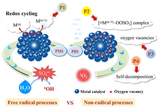 Schematic illustration of pathways of PMS/PDS activation in metal-catalyzed heterogeneous systems. P1: redox cycling; P2: formation of metal-PMS/PDS complex; P3: generation of oxygen vacancies; P4: PMS/PDS self-decomposition.