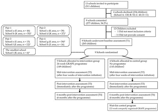 Yamakita, M.; Ando, D.; Sugita, H.; Akiyama, Y.; Sato, M.; Yokomichi, H.; Yamaguchi, K.; Yamagata, Z. Koshu GRoup Activity, Active Play and Exercise (GRAPE) Study: A Cluster Randomised Controlled Trial Protocol of a School-Based Intervention among Japanese Children. Int. J. Environ. Res. Public Health 2021, 18, 3351. https://doi.org/10.3390/ijerph18073351
