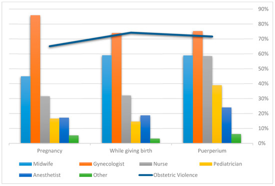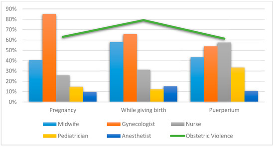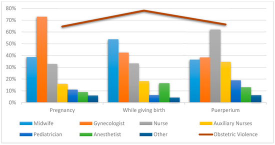 On received information and informed consent requested during procedures, the bivariate analysis showed statistically significant differences for type of care received (Public: Yes = 57.2%, n = 5197; No = 74.7%, n = 6014; Private: Yes = 8.0%, n = 724; No = 13.3%, n = 1068; Mixed: Yes = 34.9%, n = 3172; No = 12.0%, n = 968; X2 = 1248.310, df = 4; p-value < 0.001) and perceiving OV (affirmative answers: Yes = 13.8%, n = 1172; No= 68.5%, n = 4779; Negative answer: Yes = 86.2%, n = 7310; No = 31.5%, n = 2198; X2 = 4849.279, df = 2; p-value < 0.001) for received information and informed consent requested during procedures. Statistically significant differences were also found for informed consent requested and information received by women according to when they were attended to and the professionals present, except for gynecologists while giving birth (X2 = 0.006, df = 1; p-value = 0.481) and during puerperium (X2 = 1.925, df = 1; p-value = 0.087) (Table 1). Figure 1 shows the distribution of the most representative professionals at all the times when care was received (pregnancy, birth, and puerperium).