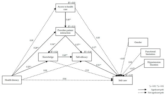 Lastly, our findings indicated that health literacy had no direct effect on self-care behaviors though they were indirectly associated. This finding was found to be consistent with a prior study, which reported that health literacy scores were not directly associated with self-care yet were indirectly associated via mediators [14]. In contrast, other research suggested an association between health literacy and hypertension self-care [51]. Although conflicting evidence on the association between health literacy and self-care were found, previous studies congruently demonstrated that self-efficacy and knowledge were significant predictors of self-care adherence [14,16,51]. Adding our results showing indirect effects of health literacy on hypertension self-care behavior via provider–patient interactions, hypertension knowledge, and hypertension control self-efficacy; the mediating factors including provider–patient interactions, knowledge, and self-efficacy may have contributed to untangling the mechanisms underlying health literacy and self-care behavior.