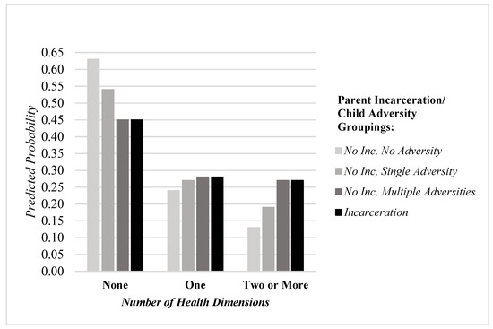 The analysis proceeded as follows. First, descriptive statistics for all variables included in the analyses were calculated. Second, multivariate models including all covariates were estimated. Specifically, multinomial logistic regression was employed to examine the change in the relative risk of a single health condition or multiple health conditions (relative to none) in each of the four health dimensions (i.e., health difficulties, chronic physical conditions, developmental disorders, and mental health conditions) attributable to parental incarceration. Furthermore, negative binomial regression was employed to examine the change in the rate of health conditions in each of the four health dimensions due to parental incarceration. Negative binomial regression was employed in these models given health count outcomes that are zero-inflated and over-dispersed. Third, the association between parental incarceration and health conditions across dimensions was estimated using multinomial logistic regression. The initial modeling strategy took a traditional approach by first comparing those who experienced parental incarceration to those without incarceration, net of covariates. However, a second, more novel strategic comparison approach was then employed which garners estimates pertaining to incarceration but alters the reference category—first to No Incarceration, No Adversity, then to No Incarceration, Single Adversity, and then to No Incarceration, Multiple Adversities. By creating groups that vary in adversity exposure, this approach uses fitting comparisons that can help account for unobserved heterogeneity, and in so doing, “enables a more fine-tuned investigation” of whether parental incarceration is indeed a particularly potent form of adversity/hardship with unique effects on child health [36]. Finally, a figure was constructed that plots the predicted probability of none, one, or two or more health conditions across dimensions by the parent incarceration/child adversity groupings, in an effort to illustrate whether the association between parental incarceration and child health holds when strategic comparison methods are employed.