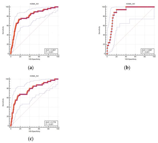 The areas under the ROC curve using the HOMA-IR cut-off for diagnosing T2DM were 0.807 in the all-subjects group (95% confidence interval (CI) 0.779–0.834), 0.897 in men (95% CI 0.857–0.929), and 0.776 in women (95% CI 0.738–0.810).