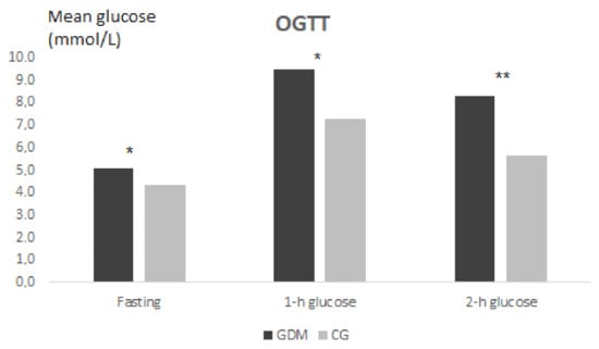 | FPG from OGTT (mmol/L) | 5.04 ± 0.69 | 4.32 ± 0.44 | 0.03 * |
