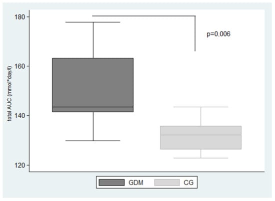 | Total AUC (mmol·day/L) ** | 149.41 ± 14.82 | 132.03 ± 6.93 | 0.0062 ** |