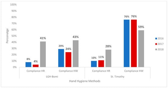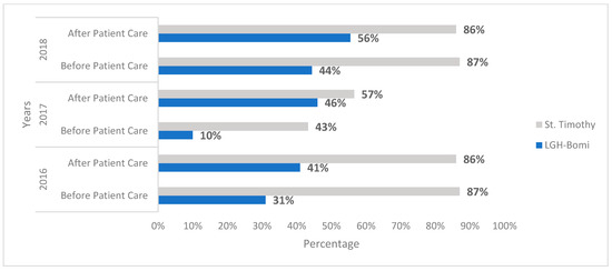 Hand hygiene audits conducted at LGH Bomi and St. Timothy in 2016 before the WASH-improvement interventions showed a baseline overall HH compliance of 36% and 86%, respectively. During the renovation period, an increase to 61% HH compliance was noted at LGH Bomi and a drop from the high baseline to 64% was noted at St. Timothy. In 2018, after WASH improvements, HH audits conducted showed an overall HH compliance of 89% and 88% at LGH Bomi and St. Timothy, respectively (Figure 2). Healthcare-worker practice of HH before and after patient contact was observed at the same three time points: 2016 (before the intervention), 2017 (during the intervention), and 2018 (after the intervention). HH compliance before patient contact in 2016 was 31% at LGH Bomi and 87% at St. Timothy; in 2017, it was 10% at LGH Bomi and 43% at St. Timothy; in 2018, it was 44% at LGH Bomi and 87% at St. Timothy (Figure 3). HH compliance after patient contact in 2016 was 41% at LGH Bomi and 86% at St. Timothy; in 2017, it was 46% at LGH Bomi and 57% at St. Timothy; in 2018, it was 56% at LGH Bomi and 86% at St. Timothy (Figure 3). In both health facilities, hand rub compliance was lower (8%, 4%, and 41% in LGH Bomi and 10%, 11%, and 28% in St. Timothy before, during, and after intervention, respectively) compared to handwashing compliance (29%, 24%, and 43% in LGH Bomi and 76%, 76%, and 59% in St. Timothy before, during, and after intervention, respectively) (Figure 4).