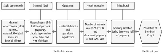 The univariate logistic regression analysis was carried out to examine the independent association between exposure and outcome variables. To account for the complex hierarchical interrelationships between each of the different blocks of health determinants, this study used a five-stage hierarchical technique (Figure 1) similar to those described by Agho et al. []. As part of hierarchical technique, we first analyzed variables from the sociodemographic block (maternal SES category, maternal Aboriginal status, and hospital of birth) along with the year of birth to establish a baseline multivariate model (model 1). Maternal/fetal variables (maternal age at birth, history of previous pregnancy, chronic hypertension, sex of baby, and type of delivery) were then fitted into model 1 (model 2). Variables in model 2 were analyzed with gestational variables including gestational diabetes and gestational hypertension (model 3). In the next stage, health promotion variables (number of ANC visits, and duration of pregnancy at first ANC visit) were studied with model 3 (model 4). In the final model (model 5), the exposure variable within behavioral blocks (smoking cessation during the second half of pregnancy) was analyzed with model 4. All analyses were conducted in Stata version 16.1 (StataCorp, College Station, TX, USA).